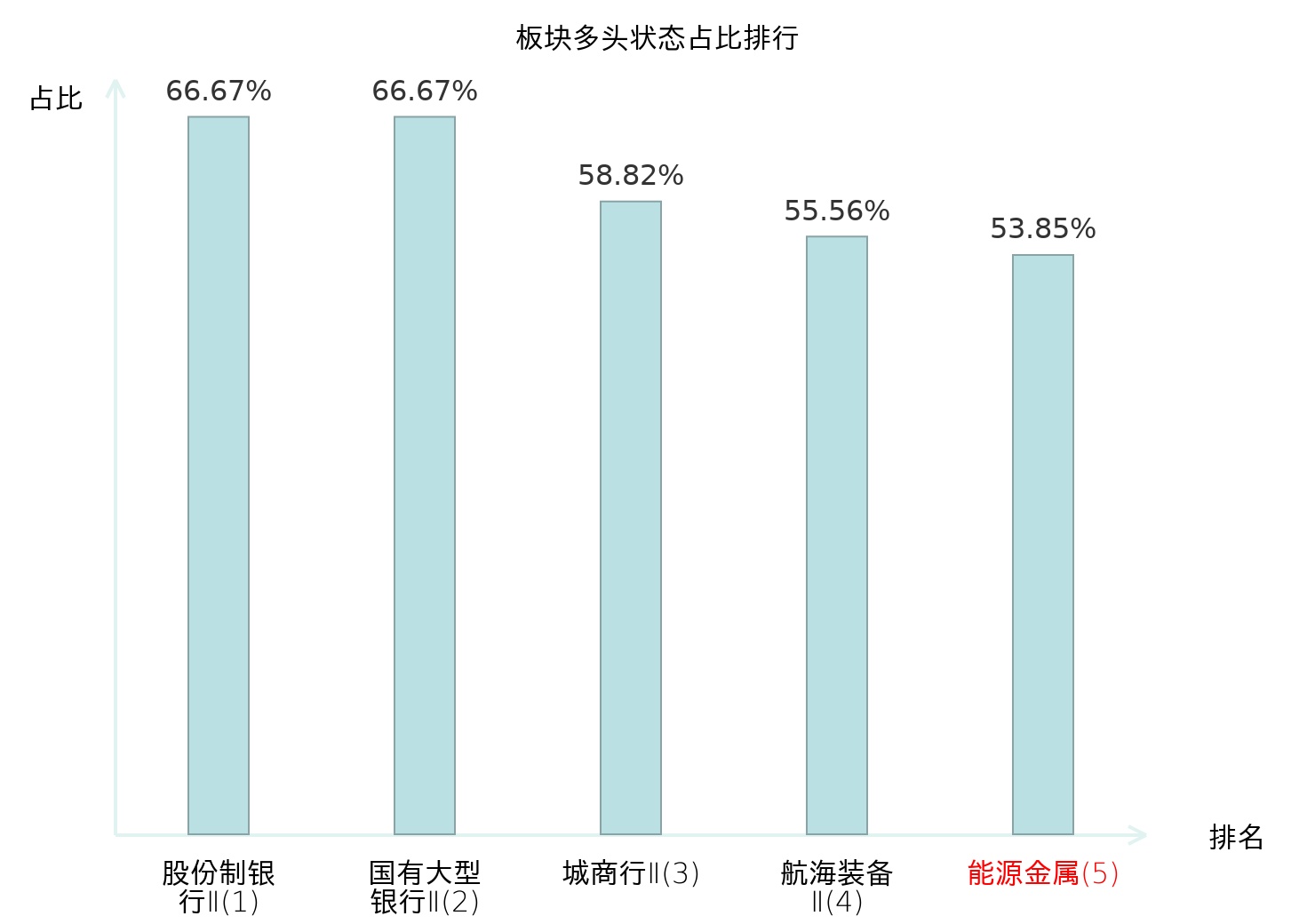 全市场所有行业板块中主力多头状态占比排名中,股份制银行Ⅱ板块位居第一。渔业板块名次提升最快,较昨日上升61位。
