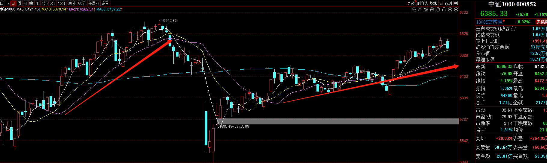 首先大盘趋势是沿着21日均线震荡上行的,这种行情是最有持续性的形态。因为他每天的上涨都经历过洗盘,后续行情我还会看前方高点的压力位。