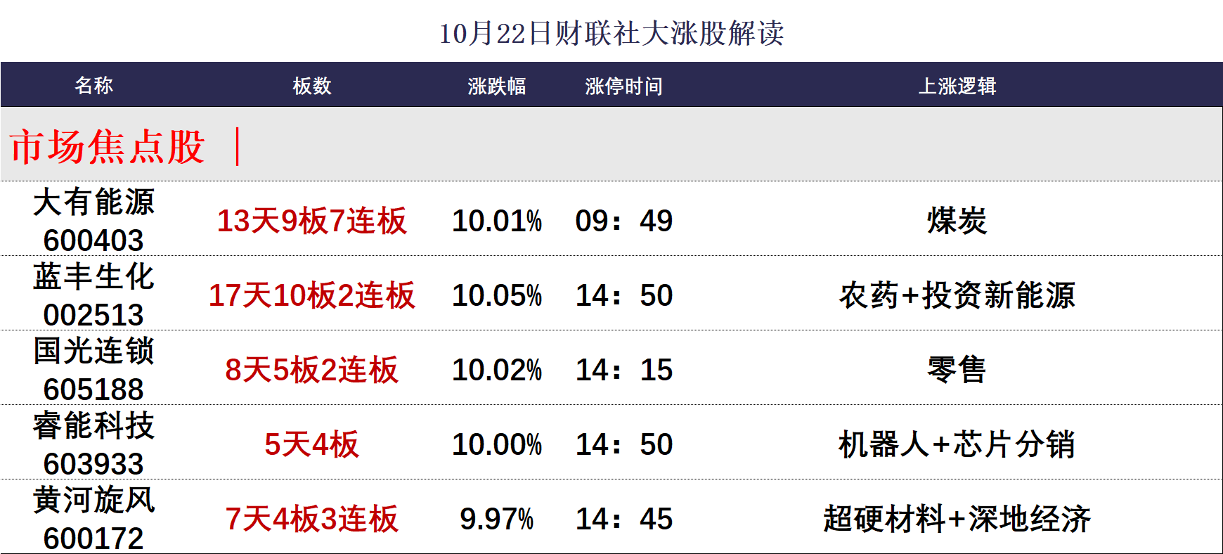 财联社10月22日讯,今日56股涨停,21股炸板,封板率为73%,大有能源13天9板,石化机械、中信重工、北方股份、神开股份、盈新发展3连板,蓝丰生化17天10板,黄河旋风、亚太药业7天4板,国光连锁8天5板,海鸥住工10天5板,睿能科技5天4板。市场全天弱势震荡,三大指数盘中翻红后均出现回落。沪深两市成交额1.67万亿,量能进一步萎缩,较上一个交易日缩量2060亿,自8月5日以来首次跌破1.7万亿。板块方面,油气、工程机械、风电设备等板块涨幅居前,贵金属、煤炭、电池等板块跌幅居前。截至收盘,沪指跌0.07%,深成指跌0.62%,创业板指0.79%。