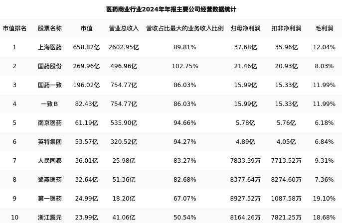 英特集团最新报告期数据为年报,下表汇总了医药商业行业内市值靠前的公司年报主要经营数据