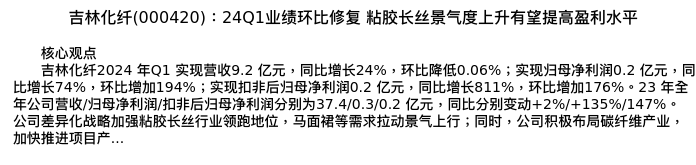 值得注意的是:2024年05月中信建投证券的卢昊/彭岩分析师,首次发布关于吉林化纤的研究报告,标题为:吉林化纤(000420):24Q1业绩环比修复 粘胶长丝景气度上升有望提高盈利水平。