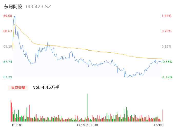 04月25日,东阿阿胶收报67.75,股价涨幅-0.51%,成交金额3.02亿元,换手率0.69%。