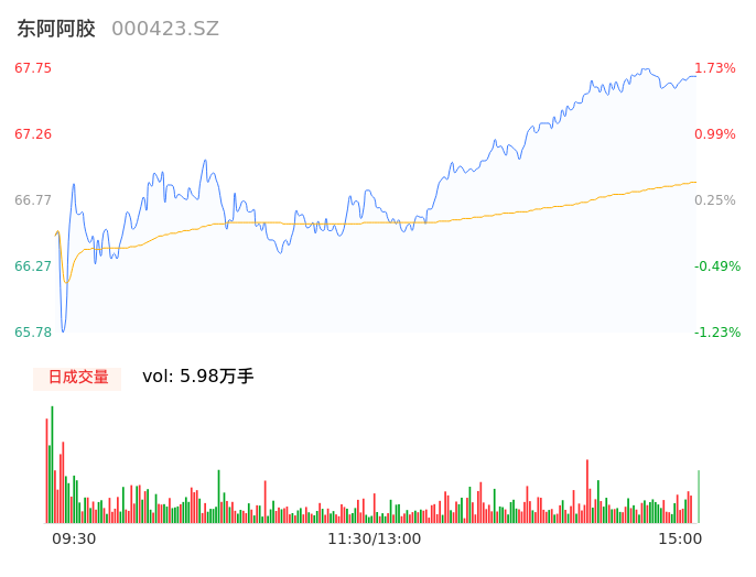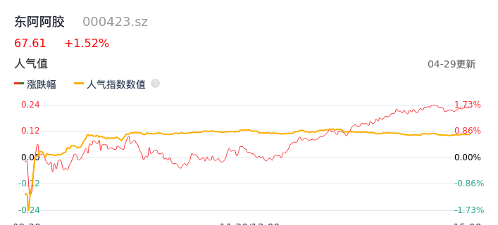04月29日,东阿阿胶收报67.61,股价涨幅1.52%,成交金额4.00亿元,换手率0.93%。