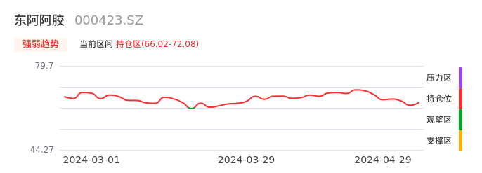 我们来看一下该股的九方特色指标强弱趋势的情况:东阿阿胶自03月22日从观望区上穿到持仓区。股价近期在多头区域持续强势上扬,上升动能仍较为充足,可积极关注。后续重点关注上方压力位:72.08元是否能突破上攻。