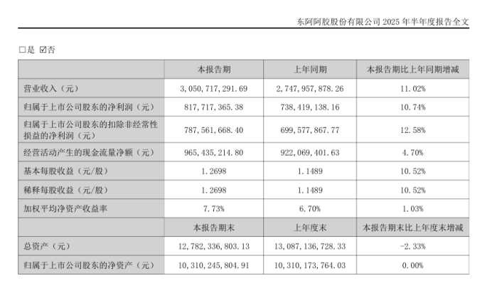 上证报中国证券网讯8月21日晚,东阿阿胶发布2025年半年度报告。数据显示,上半年东阿阿胶实现营业收入30.51亿元,同比增长11.02%;归属于上市公司股东的净利润8.18亿元,同比增长10.74%,扣除非经常性损益后的净利润同比增长12.58%。