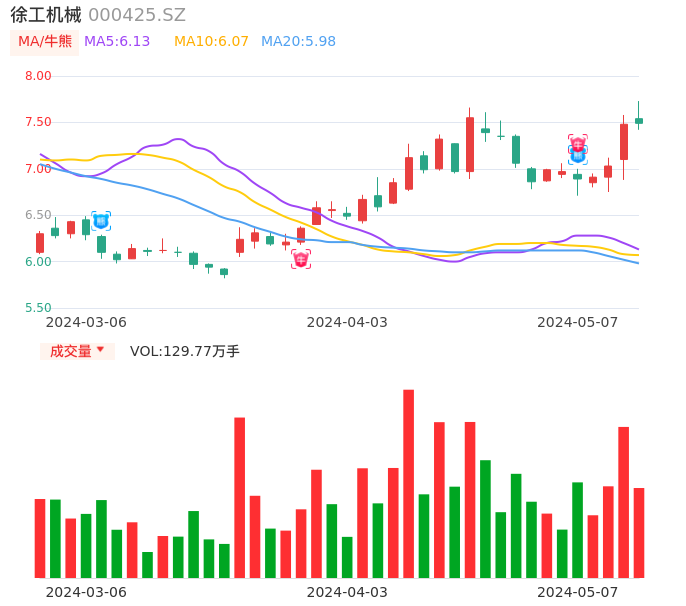 05月07日,徐工机械收报7.49,股价涨幅0.13%,成交金额9.80亿元,换手率1.60%。