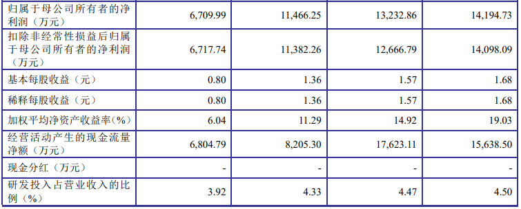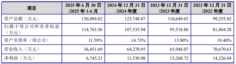 财务方面,2022年度、2023年度、2024年度、2025年6月30日,公司实现营业收入分别为7.07亿元、6.59亿元、6.43亿元、3.65亿元;同期,公司实现净利润分别为1.42亿元、1.33亿元、1.15亿元、6745.21万元。