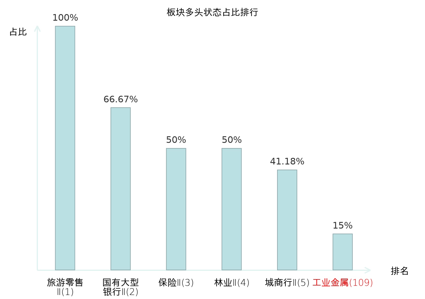 全市场所有行业板块中主力多头状态占比排名中,旅游零售Ⅱ板块位居第一。林业Ⅱ板块名次提升最快,较昨日上升87位。