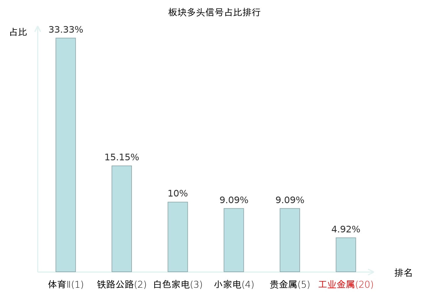 全市场所有行业板块中主力多头信号占比排名中,体育Ⅱ板块位居第一。体育Ⅱ板块名次提升最快,较昨日上升129位。