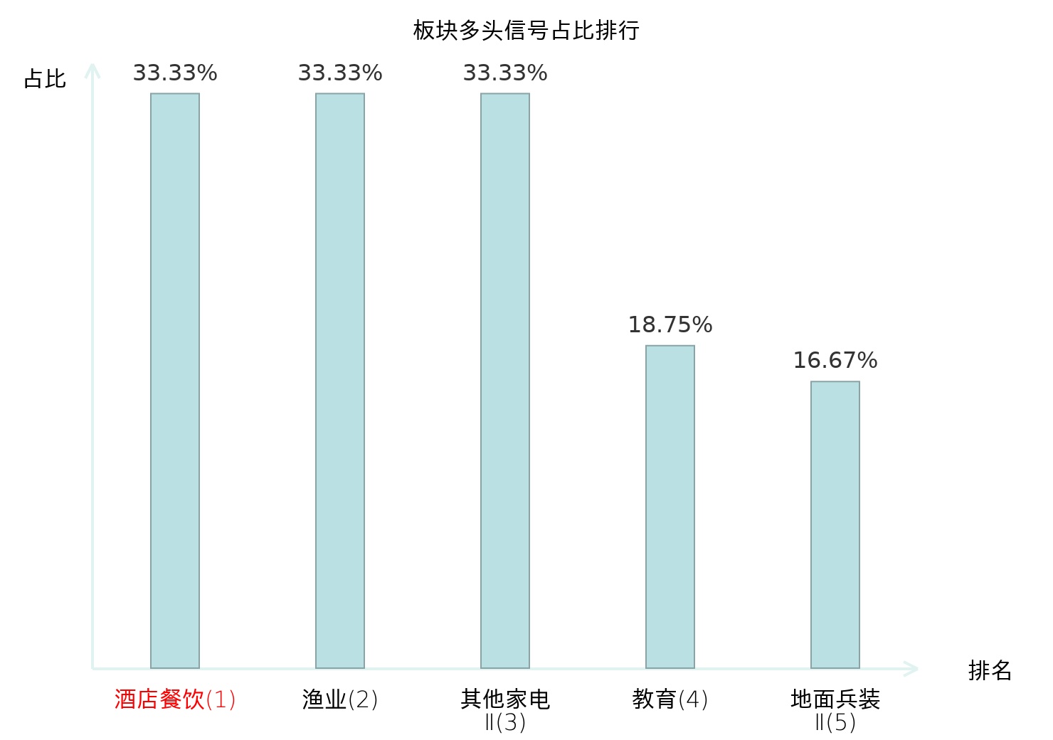 全市场所有行业板块中主力多头信号占比排名中,酒店餐饮板块位居第一。其他家电Ⅱ板块名次提升最快,较昨日上升126位。