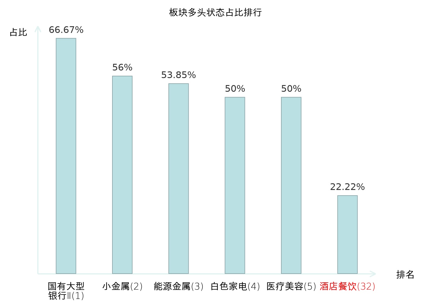 全市场所有行业板块中主力多头状态占比排名中,国有大型银行Ⅱ板块位居第一。酒店餐饮板块名次提升最快,较昨日上升59位。