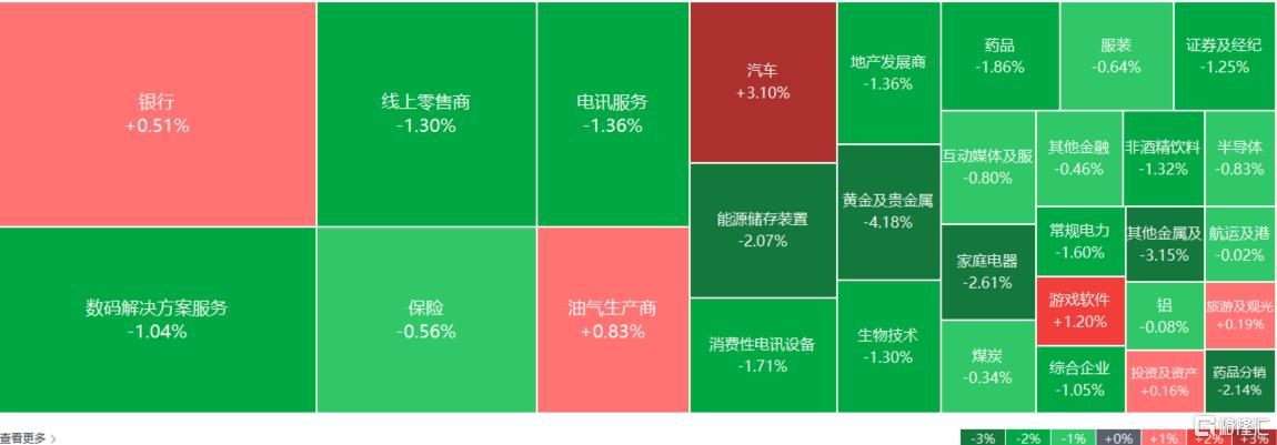 盘面上,权重科技股多数走低,阿里巴巴、小米、快手、腾讯控股跌超1%,京东、百度微跌;博彩股跌幅居前,大摩称明年牌照费升至每月收益3.5%,美高梅中国大跌超17%表现最差;金银价格大肆回落,黄金及贵金属板块下挫,紫金黄金国际、山东黄金等多股跌超5%;农业股、苹果概念、电力股、家电股、餐饮股、影视股、内房股等多数表现低迷。