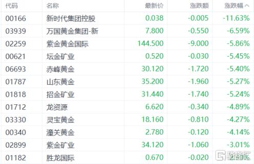 黄金及贵金属板块下挫,万国黄金集团-新跌超6%,紫金黄金国际、赤峰黄金、山东黄金、招金矿业、灵宝黄金、紫金矿业等跟跌。