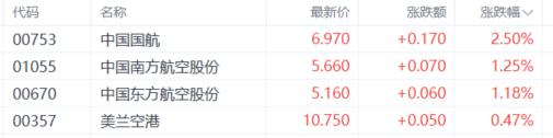 航空股再度活跃,中国国航涨2.5%,中国南方航空股份、中国东方航空股份、美兰空港等跟涨。