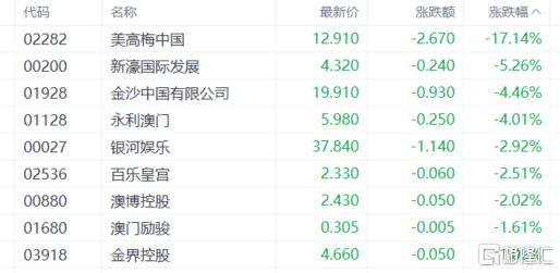 博彩股跌幅居前,美高梅中国跌超17%,新濠国际发展、金沙中国有限公司、永利澳门、银河娱乐等跟跌。