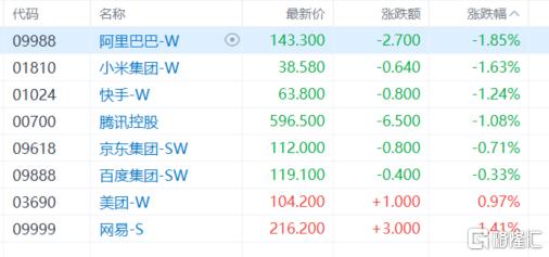权重科技股多数走低,阿里巴巴、小米、快手、腾讯控股跌超1%,京东、百度微跌;美团涨近1%,网易涨1.41%。