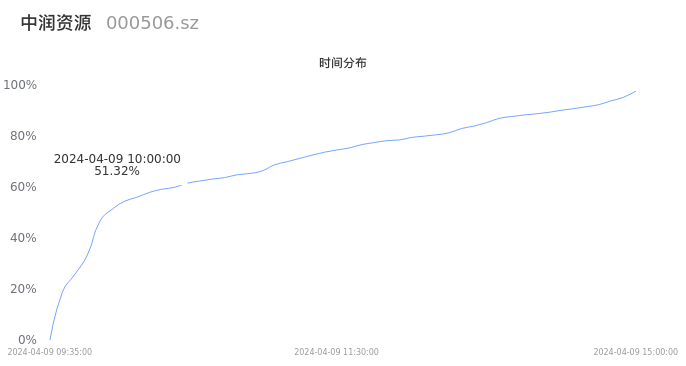 000506中润资源2024年04月09日成交281.28万手,成交金额15.37亿元,相较昨日放量157.48万手,换手率30.29%,成交活跃。