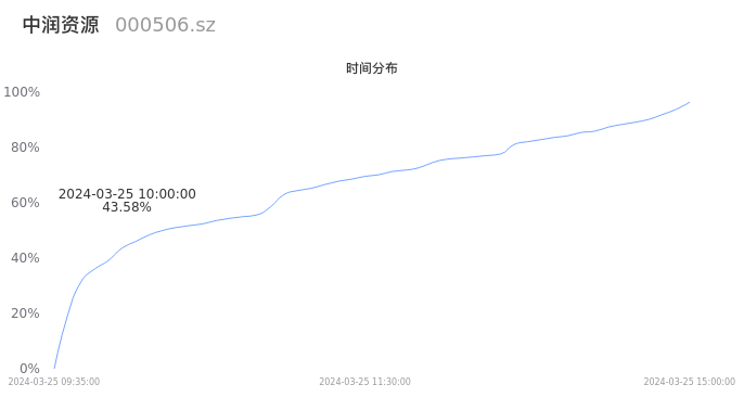 000506中润资源2024年03月25日成交91.64万手,成交金额3.75亿元,相较昨日缩量30.55万手,换手率9.87%,成交清淡。