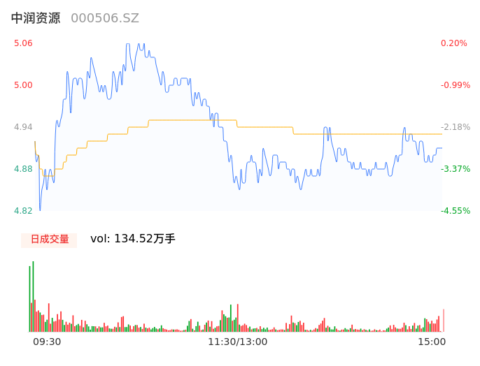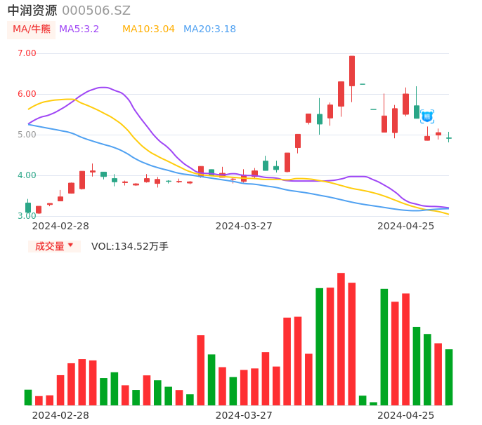 04月25日,中润资源收报4.91,股价涨幅-2.77%,成交金额6.62亿元,换手率14.48%。