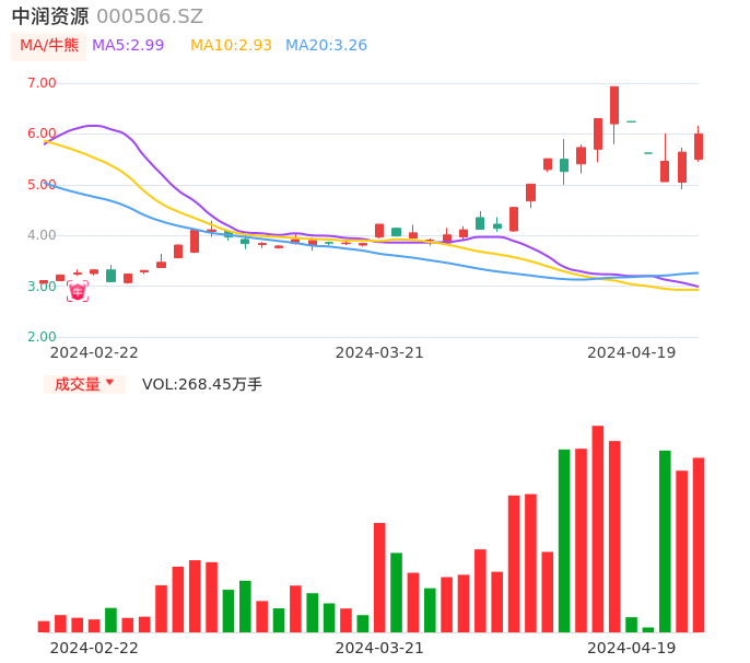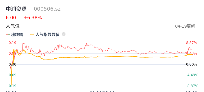 04月19日,中润资源收报6.00,股价涨幅6.38%,成交金额15.87亿元,换手率28.91%。