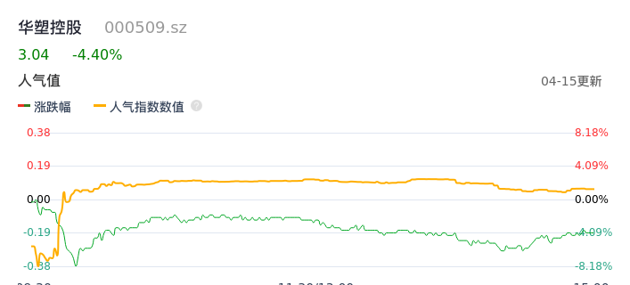 04月15日,华塑控股收报3.04,股价涨幅-4.40%,成交金额4394.75万元,换手率1.34%。