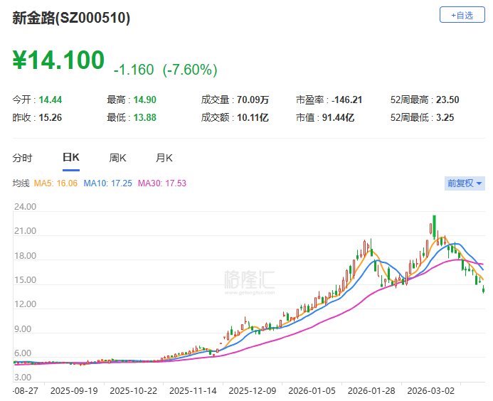 A股异动丨新金路跌9% 较月初创下的历史新高已跌去41%