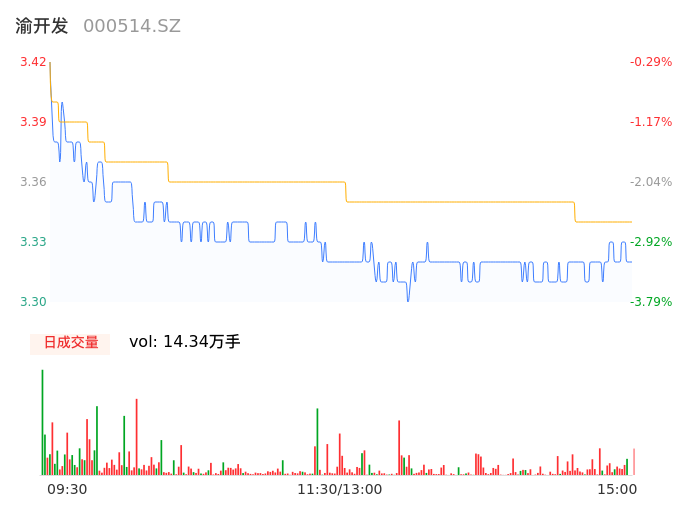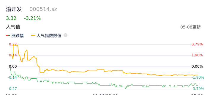05月08日,渝开发收报3.32,股价涨幅-3.21%,成交金额4793.43万元,换手率1.70%。