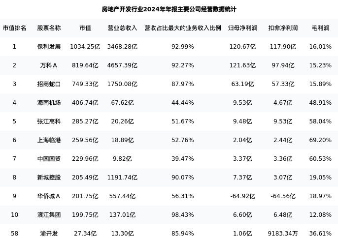 渝开发最新报告期数据为年报,下表汇总了房地产开发行业内市值靠前的公司年报主要经营数据