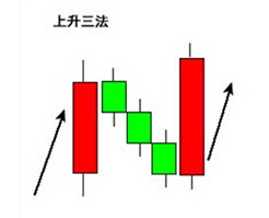 需要强调的是,在上升三法形态中,如果头、尾两根阳线的交易量超过了中间那三根K线的交易量,那么,预测该形态的上升意义更加有效。