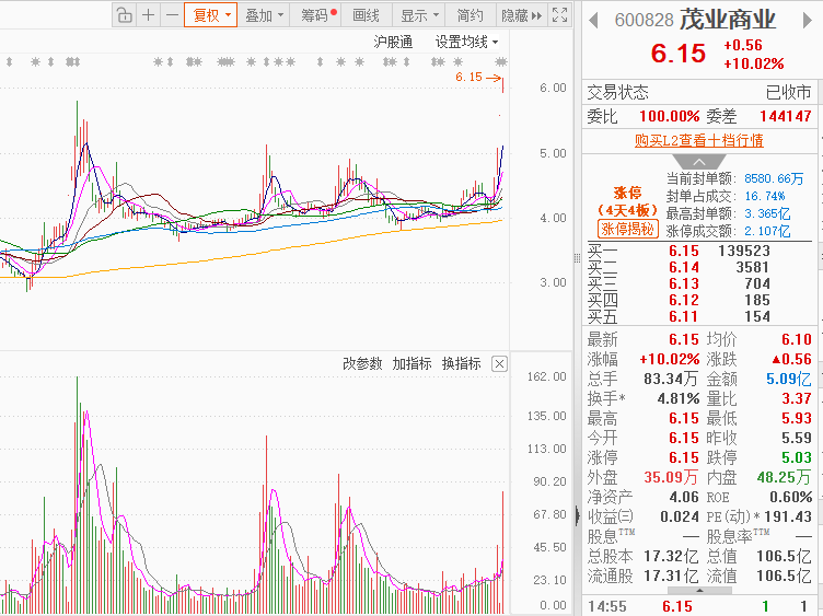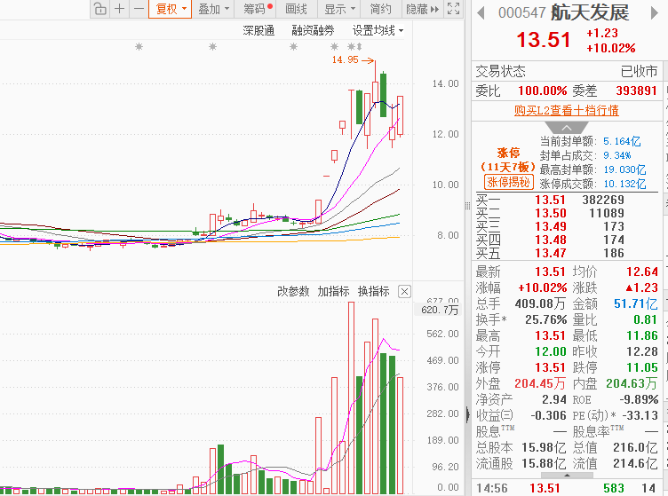 市场情绪:市场热点比较发散,上涨股票数量超过4100只,逾80只股票涨停,连板股总数9只,27股封板未遂,封板率为72%(不含ST股、退市股)。焦点股方面,并购重组的国晟科技15天10板、金富科技5连板,商业航天概念股航天发展11天7板,股权转让的梦天家居8天6板,大消费板块茂业商业4连板。