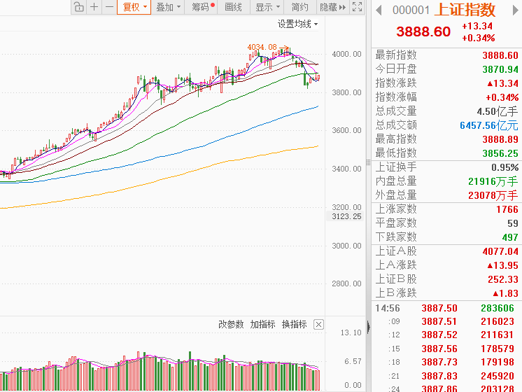 A股三大指数今日集体上涨,截止收盘,沪指涨0.34%,收报3888.60点;深证成指涨0.85%,收报12984.08点;创业板指涨0.70%,收报3052.59点。沪深两市成交额仅有15858亿,较昨日缩量1240亿。行业板块呈现普涨态势,能源金属、船舶制造、化肥行业、水泥建材、采掘行业、商业百货、汽车整车、工程建设、光学光电子板块涨幅居前,仅中药、银行、保险、化学制药、游戏板块逆市下跌。