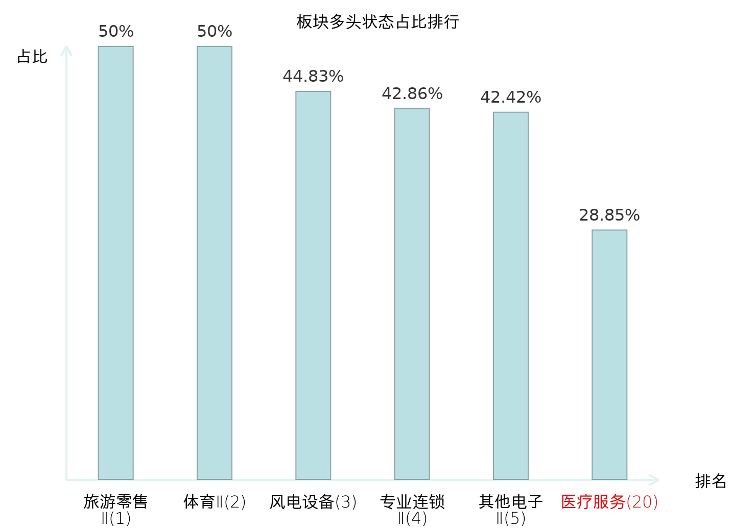 全市场所有行业板块中主力多头状态占比排名中,旅游零售Ⅱ板块位居第一。化妆品板块名次提升最快,较昨日上升66位。