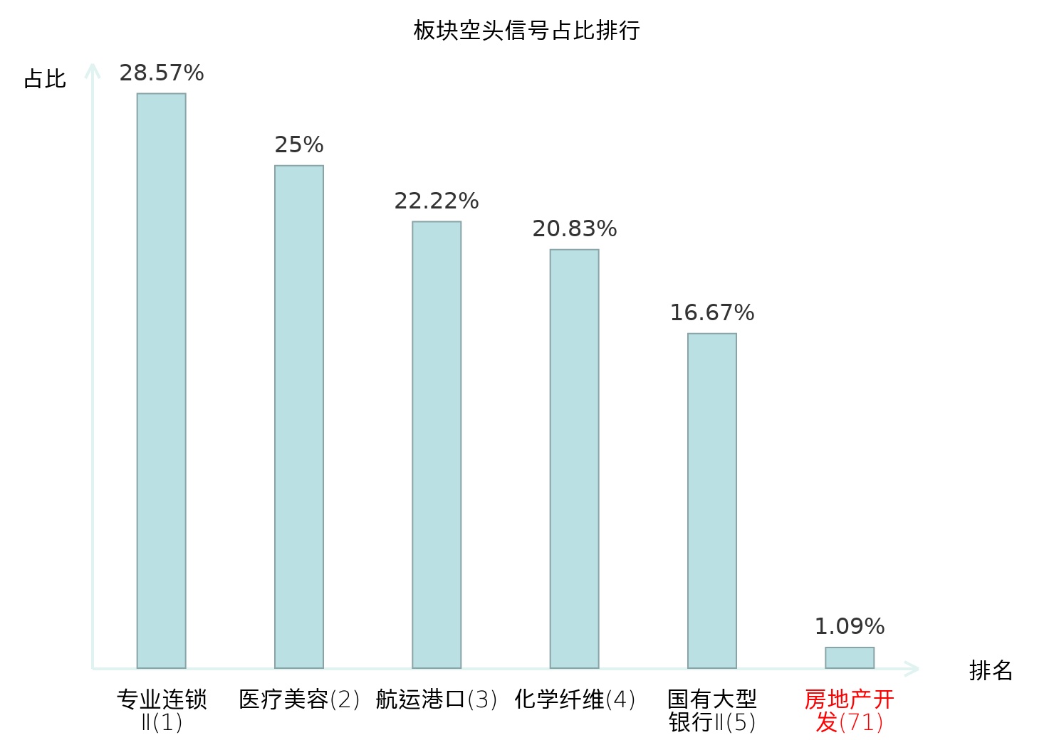 全市场所有行业板块中主力空头信号占比排名中,专业连锁Ⅱ板块位居第一。食品加工板块名次提升最快,较昨日上升106位。