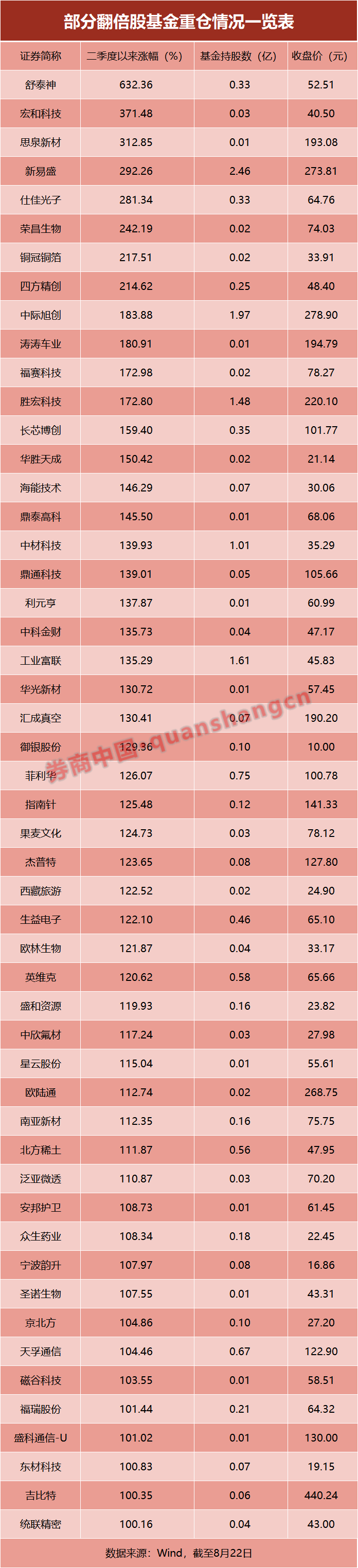 从二季度以来的累计涨幅看,截至8月22日,1254只股票中有110只实现了股价翻番,上涨超过100%。这110只股票中,有67只是公募基金重仓股,占比超过60%。
