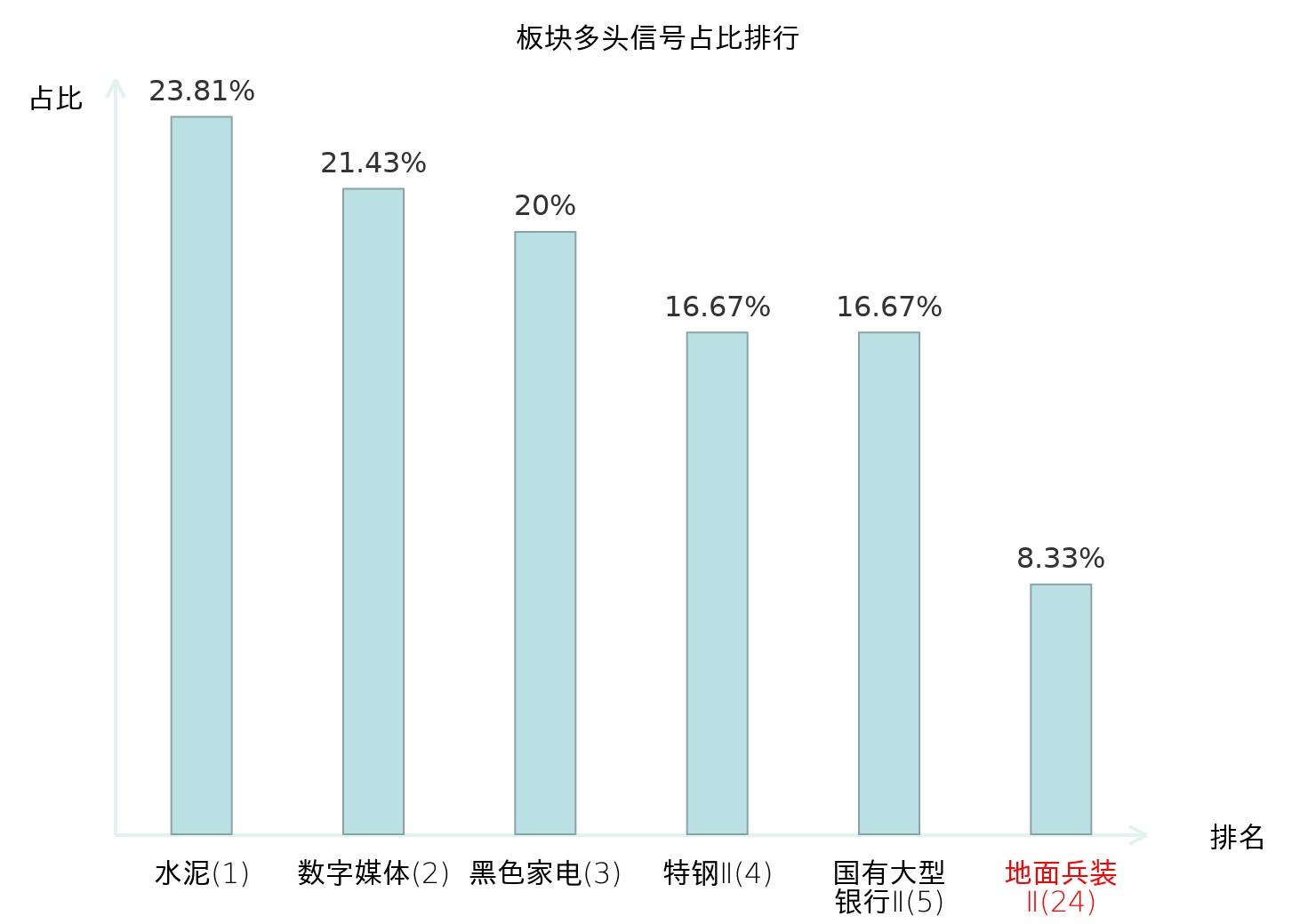 全市场所有行业板块中主力多头信号占比排名中,水泥板块位居第一。焦炭Ⅱ板块名次提升最快,较昨日上升115位。