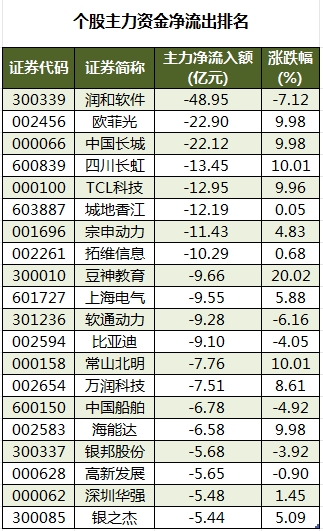 今日有3072只个股被主力资金净卖出,其中,155股被主力资金净卖出超1亿元。主力资金净流出最多的个股是润和软件,净流出金额为48.95亿元;主力资金净流出居前的个股还有欧菲光、中国长城、四川长虹、TCL科技、城地香江,净流出金额分别为22.9亿元、22.12亿元、13.45亿元、12.95亿元、12.19亿元。