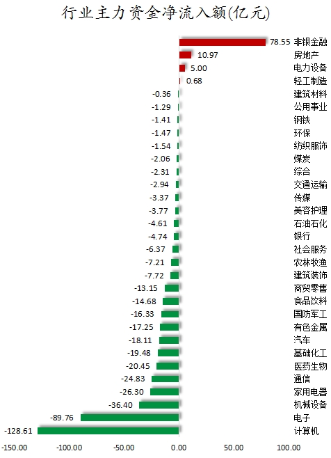 从行业来看,申万所属的31个一级行业,今日有4个行业主力资金呈现净流入,其中,非银金融行业主力资金净流入最多,净流入金额为78.55亿元;行业主力资金净流入居前的还有房地产、电力设备,净流入金额分别为10.97亿元、5亿元。27个行业主力资金呈现净流出,其中,计算机行业主力资金净流出最多,净流出金额为128.61亿元;行业主力资金净流出靠前的还有电子、机械设备、家用电器、通信、医药生物,净流出金额分别为89.76亿元、36.4亿元、26.3亿元、24.83亿元、20.45亿元。