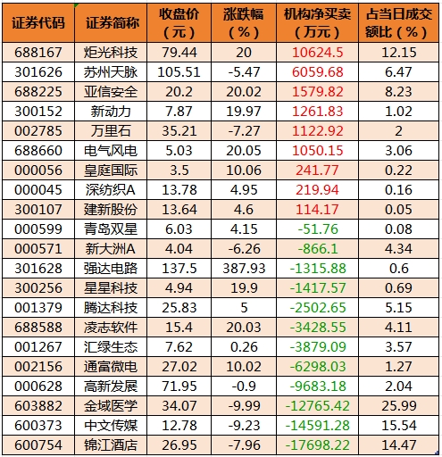 盘后龙虎榜数据显示,今日机构席位资金合计净卖出约5.22亿元。其中,净买入的个股9只,净卖出的个股12只。机构净买入最多的股票是炬光科技,净买入金额约1.06亿元;机构净买入的还有苏州天脉、亚信安全、新动力等股。机构净卖出最多的股票是锦江酒店,净卖出金额约1.77亿元;机构净卖出居前的还有中文传媒、金域医学、高新发展等股。