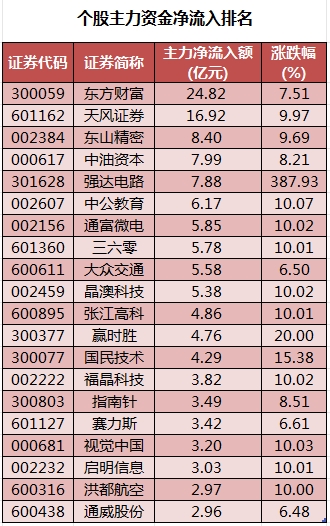 从个股来看,今日有2020只个股获主力资金净流入,其中,108股获主力资金净流入超1亿元。东方财富主力资金净流入最多,净流入金额为24.82亿元;主力资金净流入居前的个股还有天风证券、东山精密、中油资本、强达电路、中公教育,净流入金额分别为16.92亿元、8.4亿元、7.99亿元、7.88亿元、6.17亿元。
