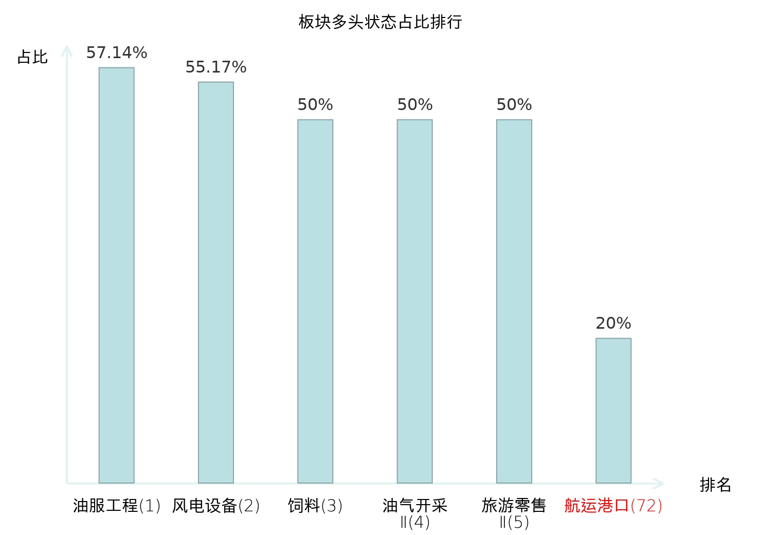 全市场所有行业板块中主力多头状态占比排名中,油服工程板块位居第一。非金属材料Ⅱ板块名次提升最快,较昨日上升67位。