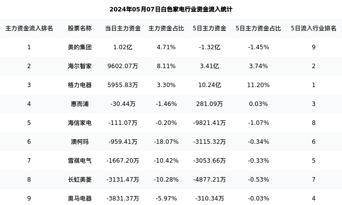 从主力资金流向来看,白色家电行业今日主力资金流入26.12亿元,在所有申万二级行业中排名:124/131。