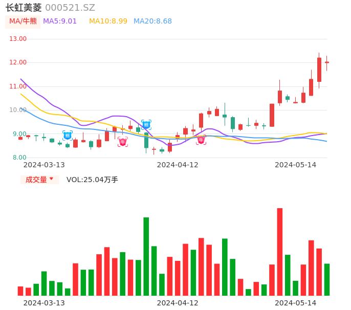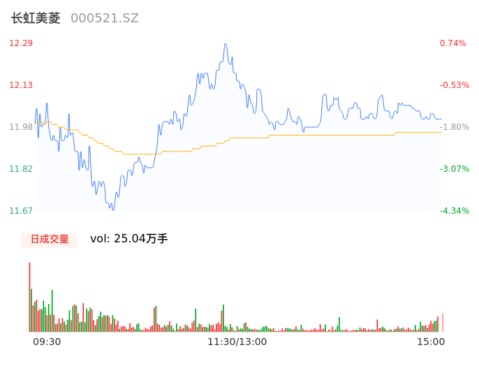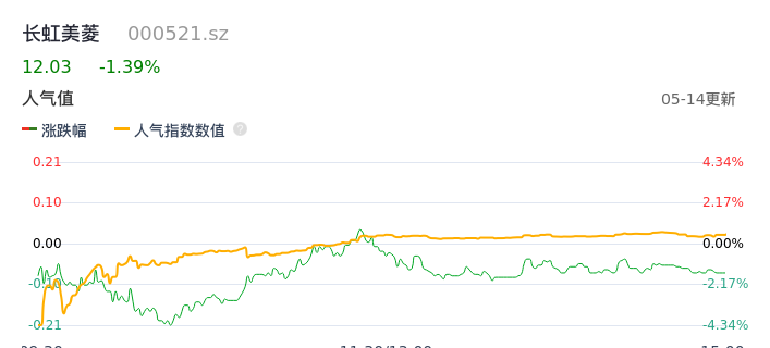 05月14日,长虹美菱收报12.03,股价涨幅-1.39%,成交金额2.99亿元,换手率2.86%。