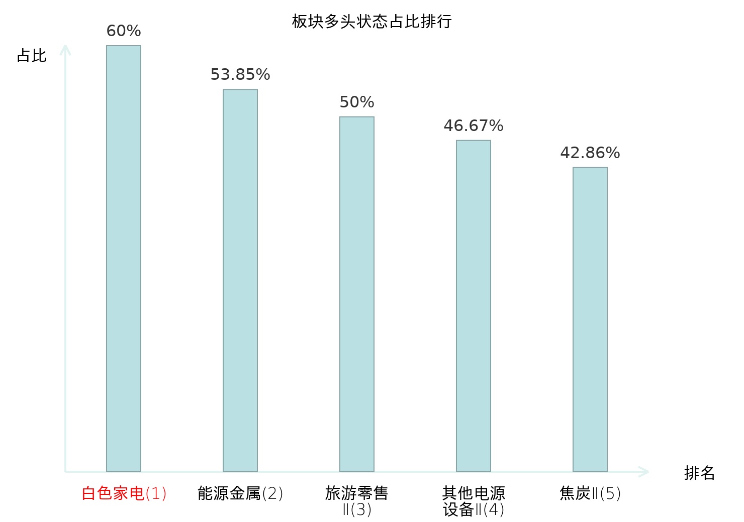 全市场所有行业板块中主力多头状态占比排名中,白色家电板块位居第一。油服工程板块名次提升最快,较昨日上升87位。