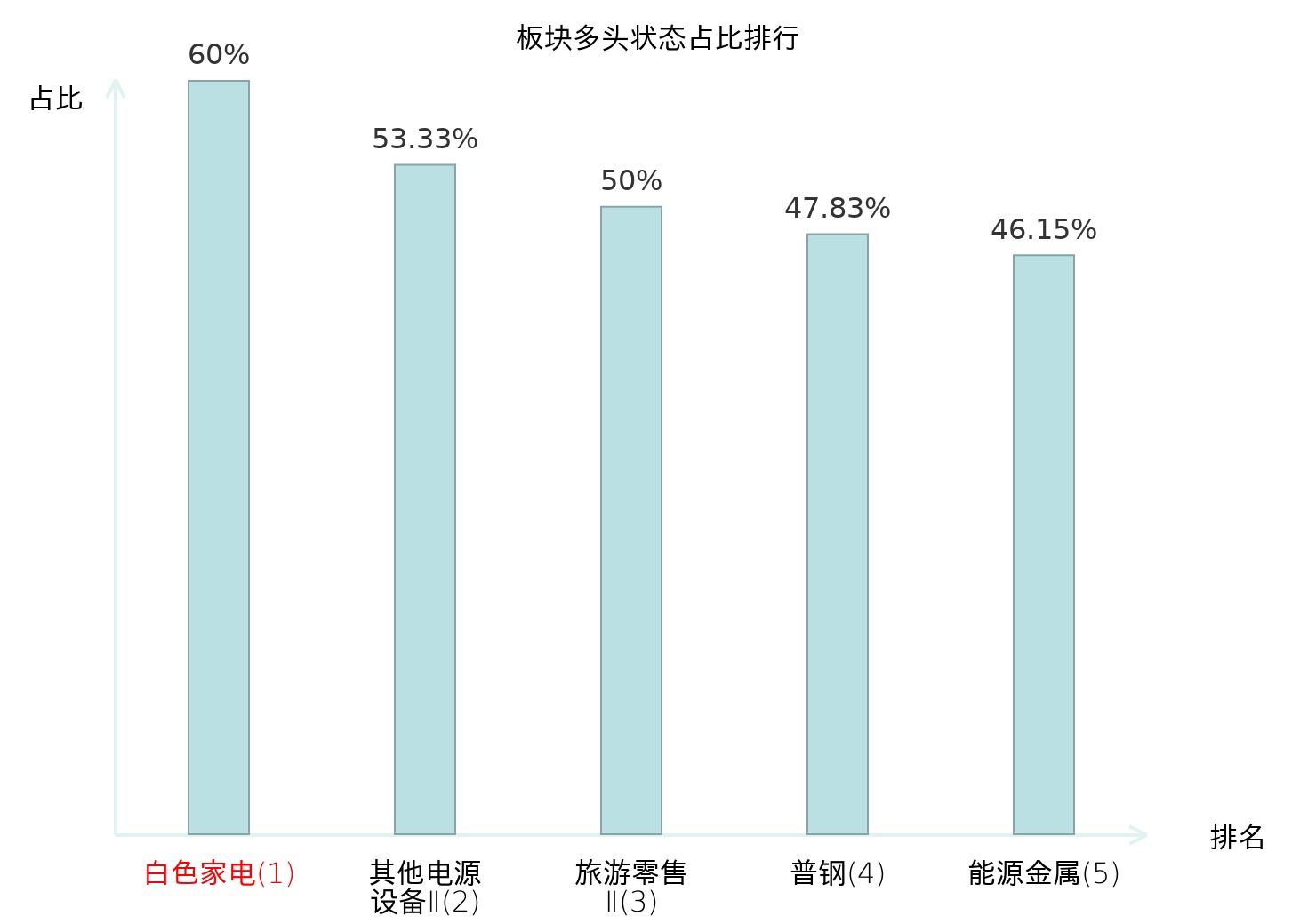 全市场所有行业板块中主力多头状态占比排名中,白色家电板块位居第一。照明设备Ⅱ板块名次提升最快,较昨日上升55位。