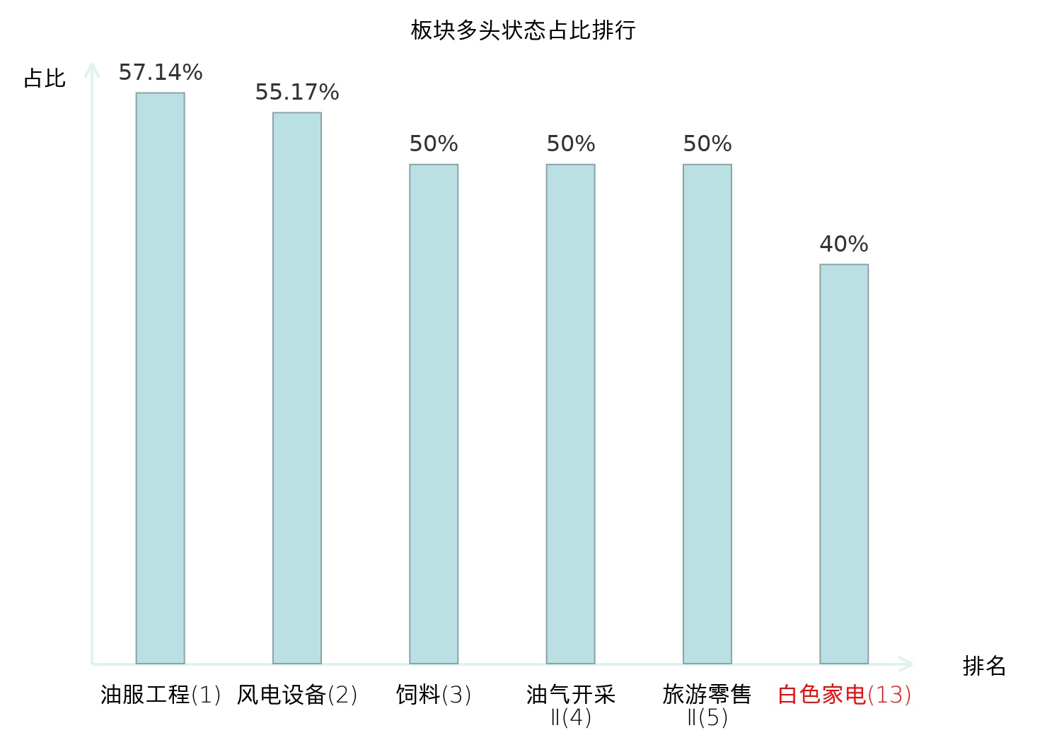 全市场所有行业板块中主力多头状态占比排名中,油服工程板块位居第一。非金属材料Ⅱ板块名次提升最快,较昨日上升67位。