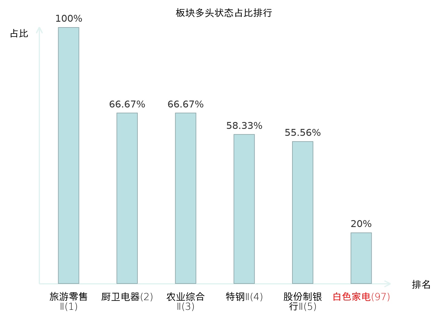 全市场所有行业板块中主力多头状态占比排名中,旅游零售Ⅱ板块位居第一。农商行Ⅱ板块名次提升最快,较昨日上升78位。