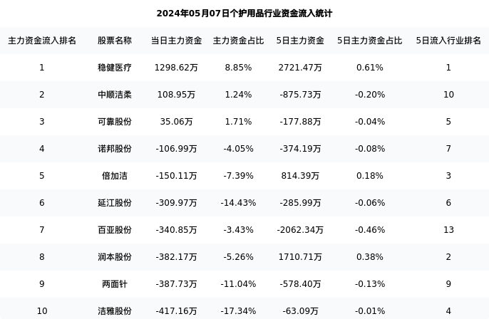 从主力资金流向来看,个护用品行业今日主力资金流入9342.13万元,在所有申万二级行业中排名:104/131。