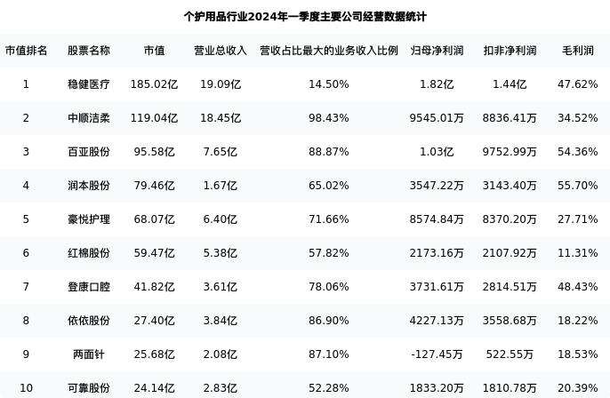 红棉股份最新报告期数据为一季度,下表汇总了个护用品行业内市值靠前的公司一季度主要经营数据