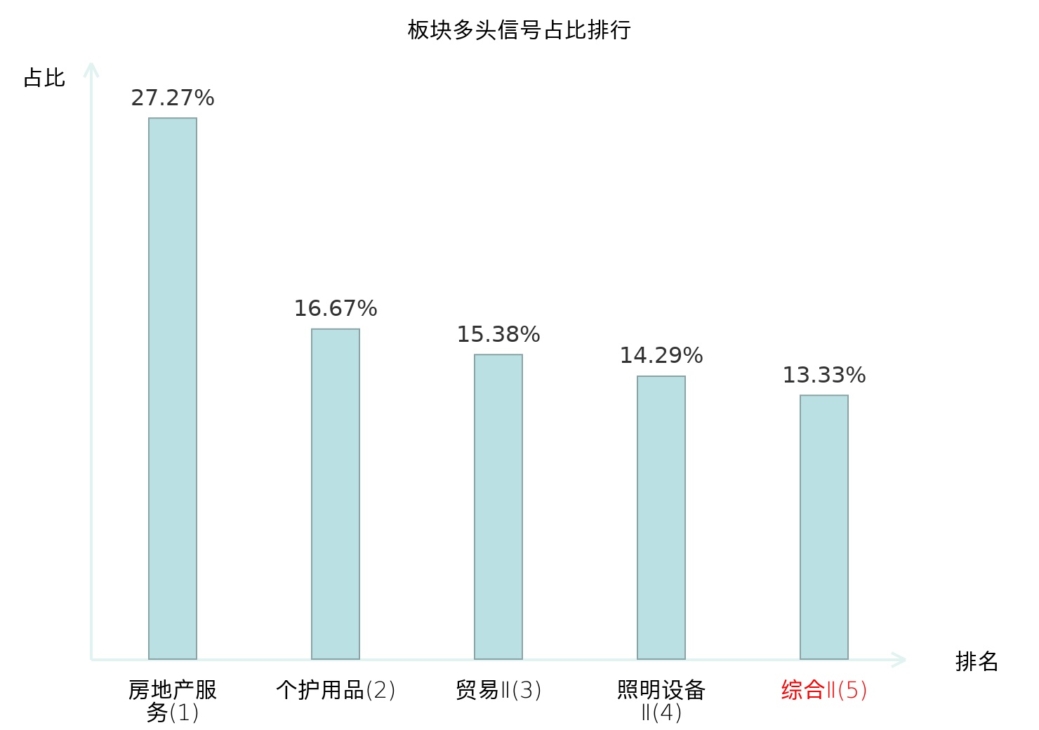 全市场所有行业板块中主力多头信号占比排名中,房地产服务板块位居第一。房地产服务板块名次提升最快,较昨日上升116位。