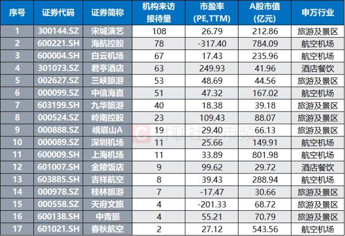 相关概念股方面,筛选旅游、酒店、出行相关标的,截至11月7日数据,累计共有17股年内获机构调研。其中,宋城演艺、海航控股、白云机场、君亭酒店、三峡旅游、中信海直年内机构调研量相对较高,分别达108次、78次、67次、53次、51次。同时,九华旅游、岭南控股、峨眉山A、深圳机场、上海机场等股也获机构重点关注。